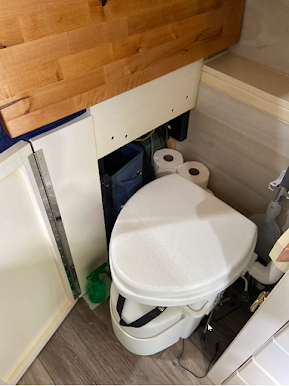 With the top down and doors closed toilet is hidden and the space is usable as a counter top again. Curtains below the bed help hide the packed garage area.