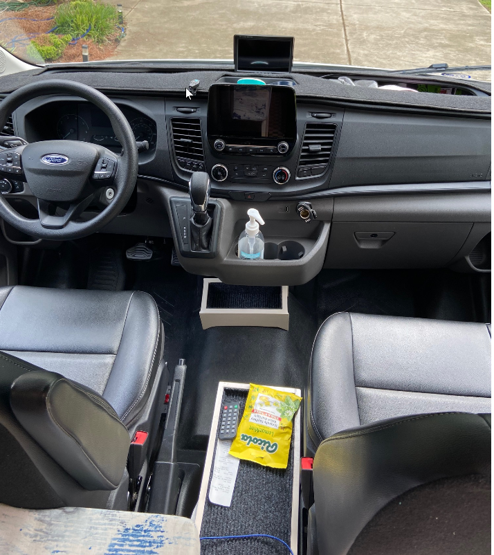The view from the kitchen looking forward. The camera installation is barely visible now that all those cables are neatly hidden from view. The shelf over the cockpit came with the van and we have packed it tight. Note the curtains on either side of the cab. These curtains easily slide along the track at the top to provide privacy when you need it. The curtains also provide thermal protection to isolate the cab from the rest of the van.
